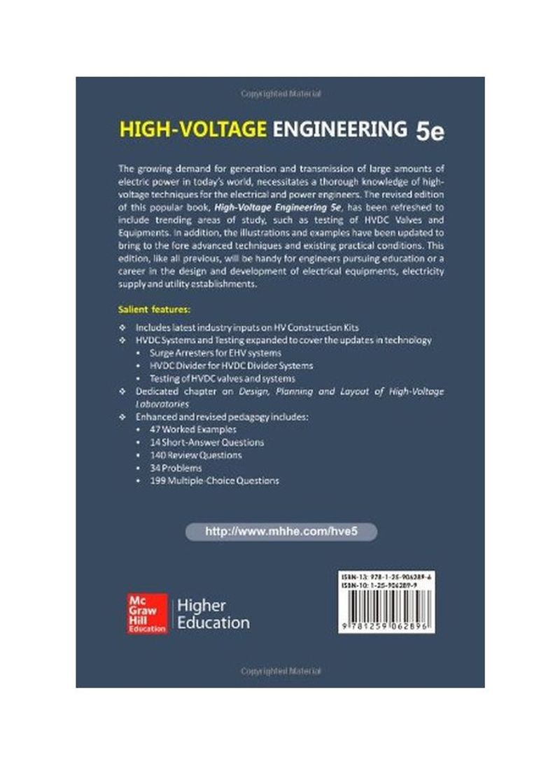 The growing demand for generation and transmission of large amounts of electric power in today's world, necessitates a thorough knowledge of high voltage techniques for the electrical and power engineers. The revised edition of this popular book, High-Voltage Engineering fifth edition, has been refreshed to include trending areas of study, such as testing of HVDC Valves and Equipment's. In addition, the illustrations and examples have been updated to bring to the fore advanced techniques and existing practical conditions. This edition, like all previous, will be handy for engineers pursuing education or a career in the design and development of electrical equipment's, electricity supply and utility establishments. Salient features:Includes latest industry inputs on HV Construction Kits.Dedicated chapter on Design, Planning and Layout of High-Voltage Laboratories.Enhanced and revised pedagogy includes:47 Worked Examples14 Short-Answer Questions140 Review Questions34 Problems199 Multiple-Choice Questions