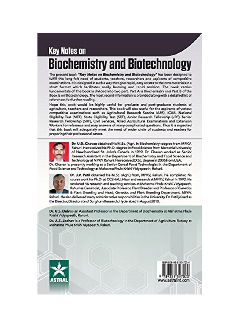 The present book "Key Notes on Biochemistry and Biotechnology" has been designed to fulfill this long felt need of students, teachers, researchers and aspirants of competitive examinations. It is designed in such a way that give rapid, easy access to the core materials in a short format which facilitates easily learning and rapid revision. The book carries fundamentals of The book is divided into two part. Part A is Biochemistry and Part B of the Book is on Biotechnology. The most recent information is provided along with a detailed list of references for further reading. Hope this book would be highly useful for graduate and post-graduate students of agriculture, teachers and researchers. This book will also useful for the aspirants of various competitive examinations such as Agricultural Research Service (ARS), ICAR- National Eligibility Test (NET), State Eligibility Test (SET), Junior Research Fellowship (JRF), Senior Research Fellowship (SRF), Civil Services, Allied Agricultural Examinations and Extension Workers for reference and easy answers of many complicated questions. Thus it is expected that this book will adequately meet the need of wider circle of students and readers for preparing their professional career.