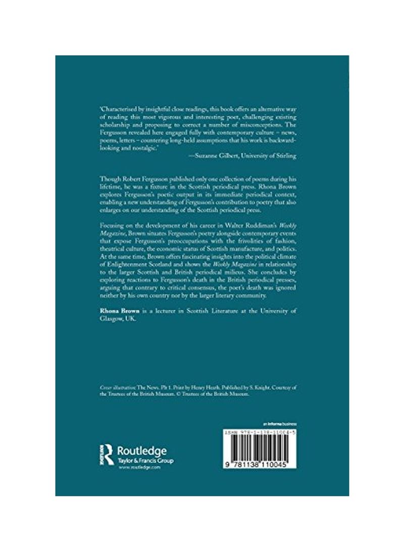 Though Robert Fergusson published only one collection of poems during his lifetime, he was a fixture in the Scottish periodical press. Rhona Brown explores Fergusson's poetic output in its immediate periodical context, enabling a new understanding of Fergusson's contribution to poetry that also enlarges on our understanding of the Scottish periodical press. Focusing on the development of his career in Walter Ruddiman's Weekly Magazine, Brown situates Fergusson's poetry alongside contemporary events that expose Fergusson's preoccupations with the frivolities of fashion, theatrical culture, the economic status of Scottish manufacture, and politics. At the same time, Brown offers fascinating insights into the political climate of Enlightenment Scotland and shows the Weekly Magazine in relationship to the larger Scottish and British periodical milieus. She concludes by exploring reactions to Fergusson's death in the British periodical presses, arguing that contrary to critical consensus, the poet's death was ignored neither by his own country nor by the larger literary community.