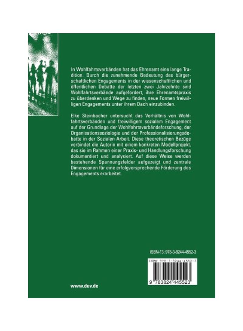 Elke Steinbacher untersucht das Verhältnis von Wohlfahrtsverbänden und freiwilligem sozialem Engagement auf theoretischer Grundlage und verbindet ihre Erkenntnisse mit einem konkreten Modellprojekt. So zeigt sie bestehende Spannungsfelder auf und erarbeitet zentrale Dimensionen für eine erfolgversprechende Förderung bürgerschaftlichen Engagements.