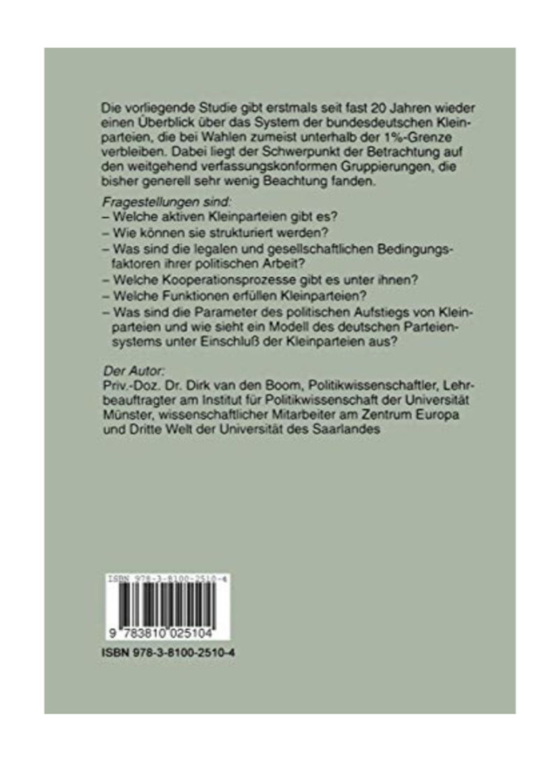 For the first time in almost 20 years, the present study gives an overview of the system of small German parties, which usually remain below the 1% limit in elections. The focus of the consideration is on the largely constitutionally compliant groupings, which have generally received very little attention so far. Questions are: - Which active small parties are there? - How can they be structured? - What are the legal and social conditions of their political work? - What cooperation processes are there among them? - Which functions do small parties fulfill? - What are the parameters of the political rise of small parties and what does a model of the German party system, including the small parties, look like?