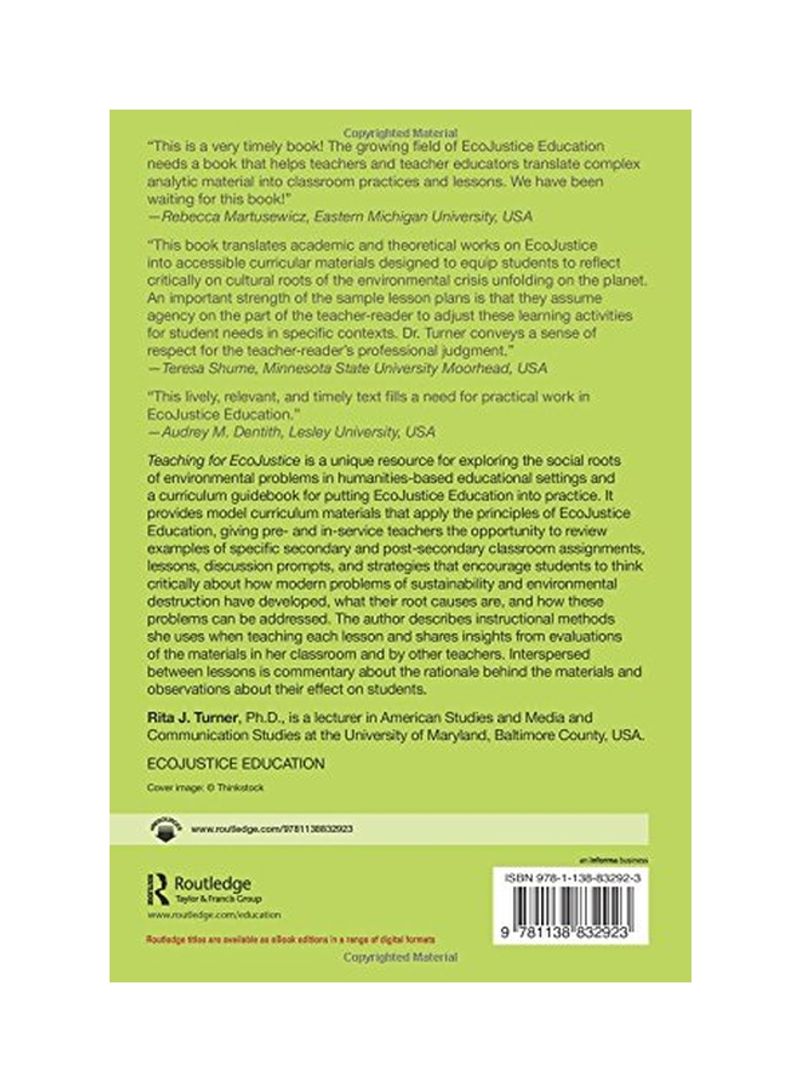 This is a very timely book! The growing field of EcoJustice Education needs a book that helps teachers and teacher educators translate complex analytic material into classroom practices and lessons. We have been waiting for this book!-Rebecca Martusewicz, Eastern Michigan University, USA. This book translates academic and theoretical works on EcoJustice into accessible curricular materials designed to equip students to reflect critically on cultural roots of the environmental crisis unfolding on the planet. An important strength of the sample lesson plans is that they assume agency on the part of the teacher-reader to adjust these learning activities for student needs in specific contexts. Dr. Turner conveys a sense of respect for the teacher-reader's professional judgment.-Teresa Shume, Minnesota State University Moorhead, USA. This lively, relevant and timely text fills a need for practical work in EcoJustice Education.-Audrey M. Dentith, Lesley University, USA