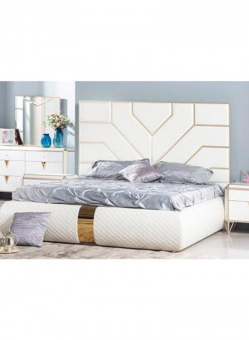 Headboard, Foot Board And Side Panels Has Leather Upholstery With Diagonal Channels And Metals Plates Giving A Luxurious Look On The Bedroom