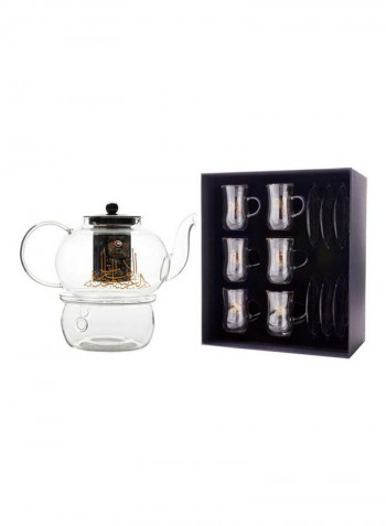 A tea set with glass tea pot along with 6 pcs of glass tea cups with glass saucers.
