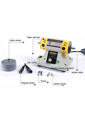 This is a kind of fine quality desktop polisher, high speed, with low noise, fine durability and provides long service time. Heat radiation holes design, with fine heat radiation effect. 0-10,000rpm stepless speed adjustable design, it can be adjusted to different speeds to meet different needs. Multi-prupose machine, suitable for grinding, polishing, carving, and drilling. Perfect for jade carving, wood beads grinding, furniture polishing, etc.. Features: High speed, high efficiency with low noise, fine durability and provides long service time. Heat radiation holes design, with fine heat radiation effect. One button to operation, convenient to use, simple and easily. Copper motor, stable performance with high load capacity, can satisfied with various of working strength. 0-10,000rpm stepless speed adjustable design, it can be adjusted to different speeds to meet different needs. Connection rod freely replacement, support connect to different accessories. Reserved carbon brush installation hole, you can change the carbon brush easily to extend service life. Multi-prupose machine, suitable for grinding, polishing, carving, and drilling. Perfect for jade carving, wood beads grinding, furniture polishing, etc.. Specifications: Name: Grinding Machine Material: metal Power: 350W Rotation speed: 0-10,000rpm Grinding wheel diameter: 75mm / 2.95in Item size: 165 * 125mm / 6.50 * 4.92in Package size: 270 * 145 * 158mm / 10.63 * 5.71 * 6.22in Package weight: 3000g / 6.61lb Packing List: 1 * Desktop Grinding Machine 2 * Nylon Grinding Disc 2 * Cone Pulley 2 * Screw 2 * Carbon Brush